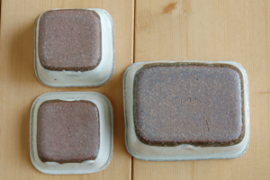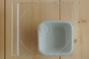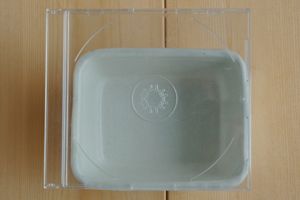 重ねてみました。 裏はこげ茶色で無釉です。 CDケースと比べてみました。 CDケースと比べてみました。 アップです。艶がある釉薬です。