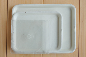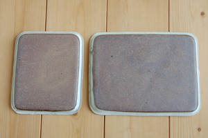 重ねてみました。 裏はこげ茶色で無釉です。 CDケースと比べてみました。 横から見ると アップです。艶がある釉薬です。