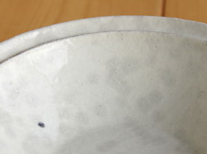 | 粉引の器は吸水性があり、水につ けると、水分を吸ってグレーの斑点のようなシミがあらわれるのも特徴です。 お使い始めは下の写真のように、水分をすいやすく斑点が出やすいですが、目止め処理をしていただく、また、しばらくお使いいただくと 変化はしにくくなります。(水の場合は乾燥すると元に戻ります) ご使用前に、目止め処理をせず、ご使用になると、水の代わりに煮汁や飲み物がしみ込む事になり、その色が取れなくなってしまいます。 ご使用前に目止め処理をしていただく事をお勧めします。 |